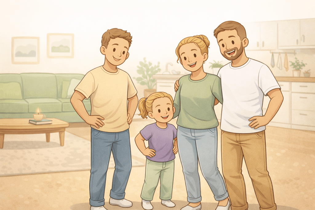 And then there’s the real version — the one with juice cups on the coffee table, someone’s hoodie on the dining chair, a half-finished school project, and a partner who somehow never sees the crumbs on the counter.