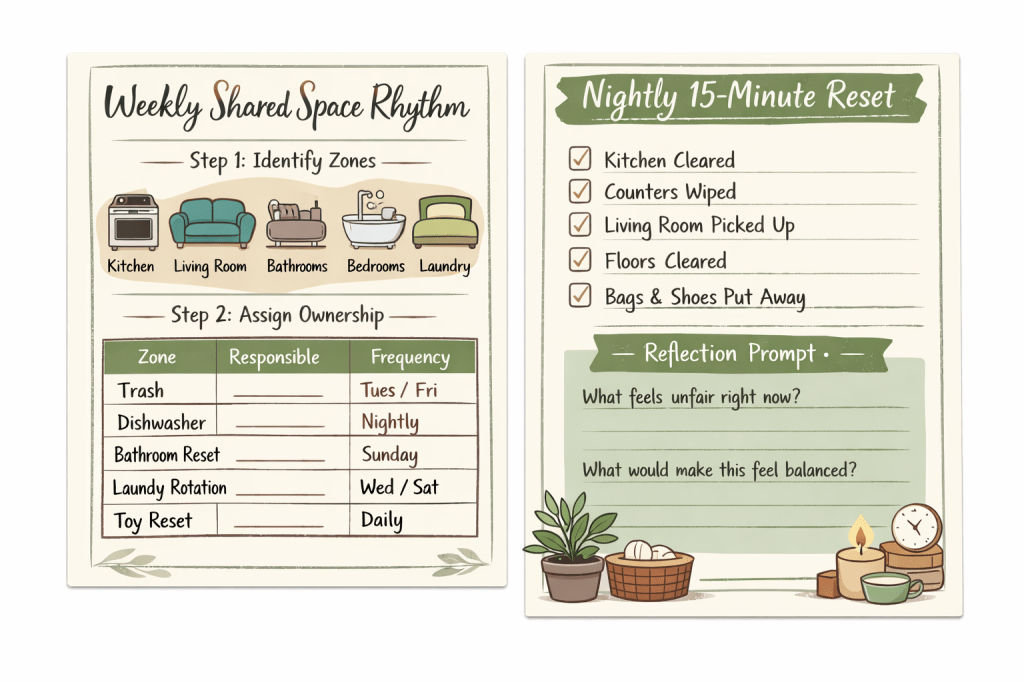 - Assign zones (bathroom, trash, dishes, laundry rotation)